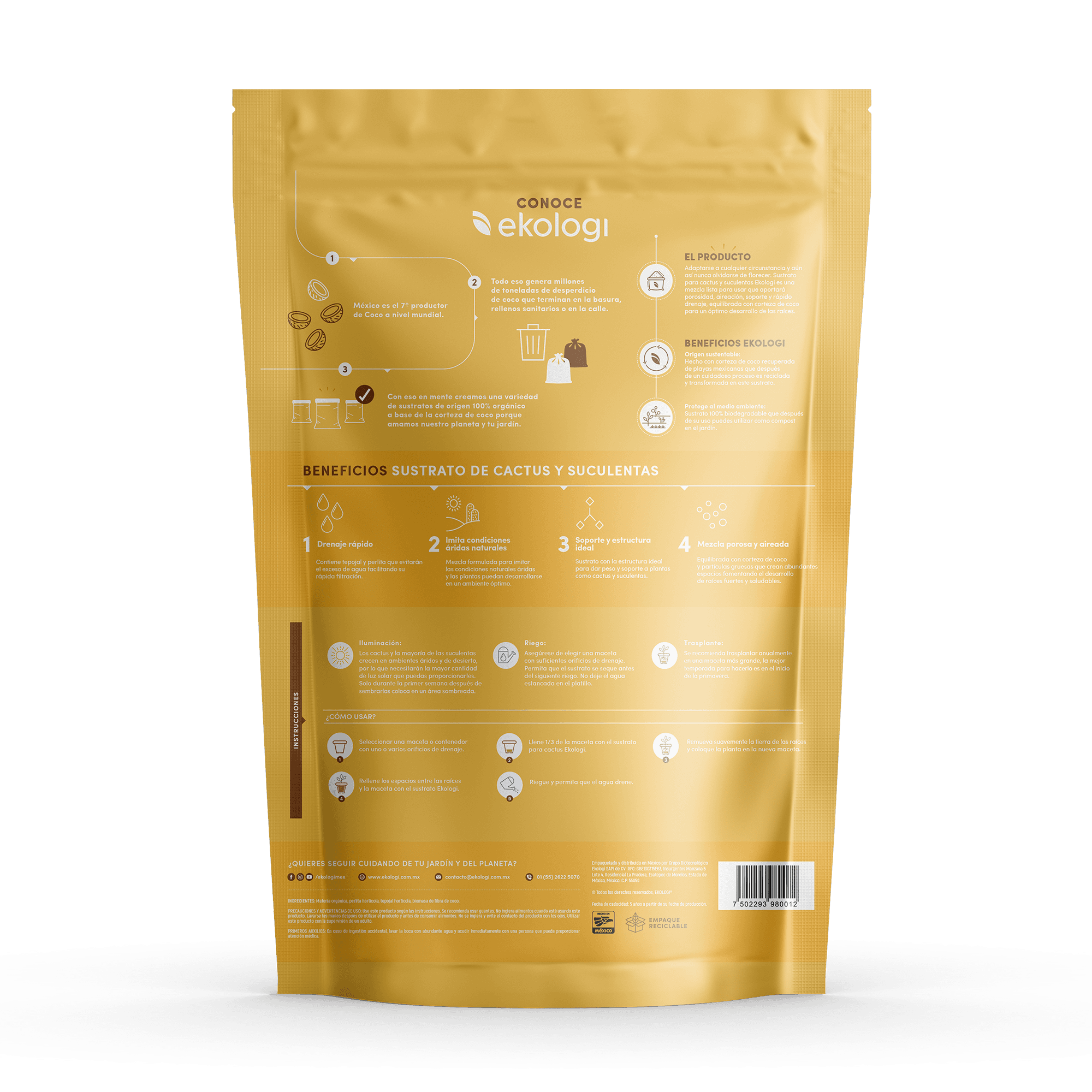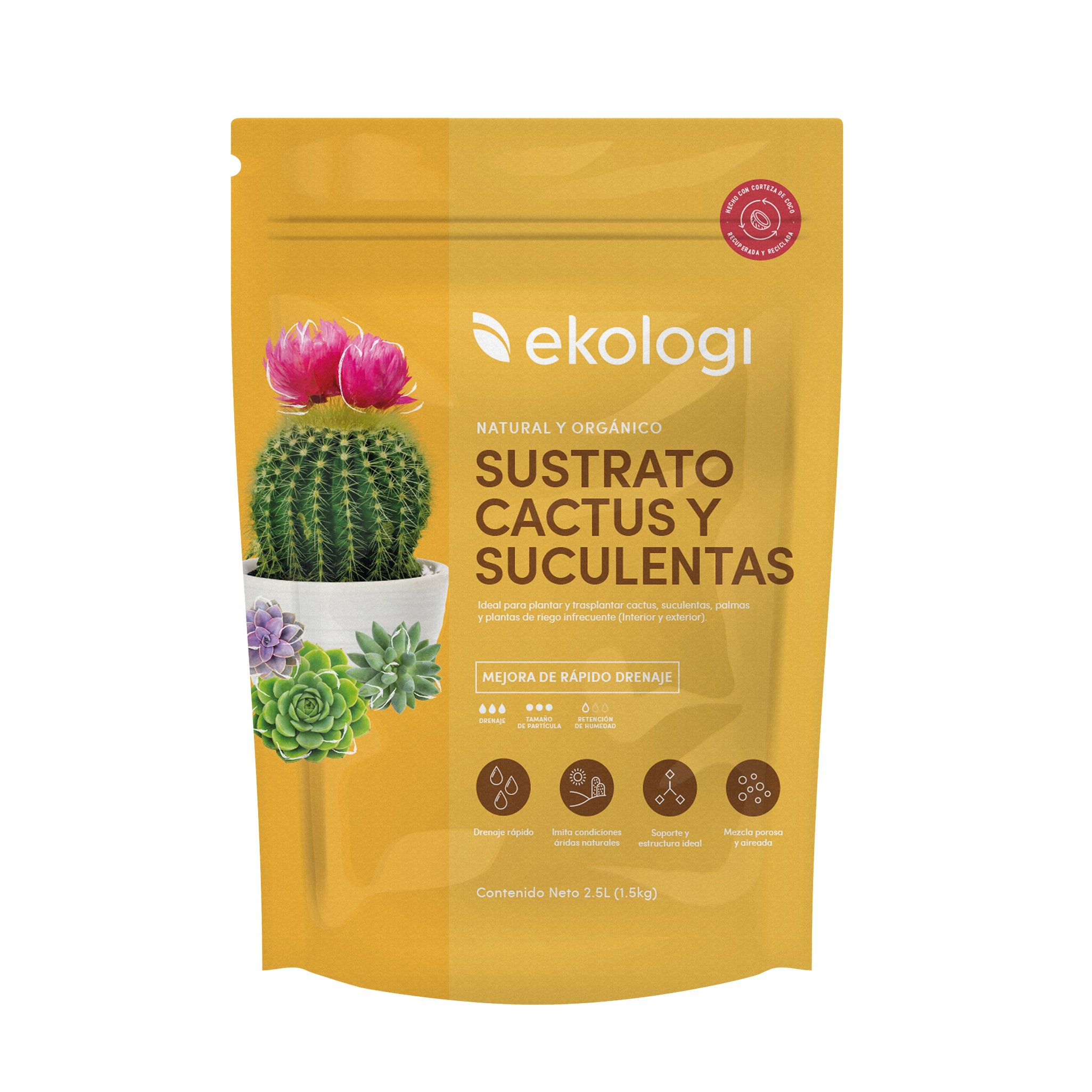 Adaptarse a cualquier circunstancia y aun así nunca olvidarse de florecer. Sustrato para cactus y suculentes EKOLOGI es una mezcla lista para usar que aportara porosidad, aireación, soporte y rápido drenaje, equilibrada con corteza de coco para un optimo desarrollo de las raíces.